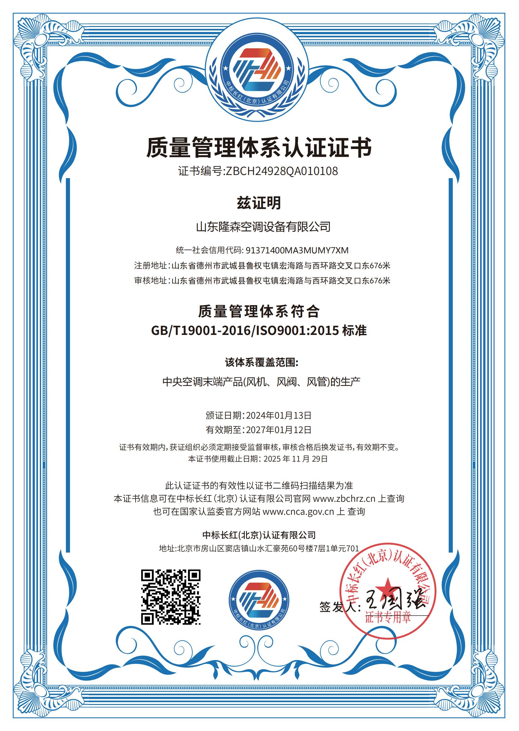 • 質量管理體系證證書